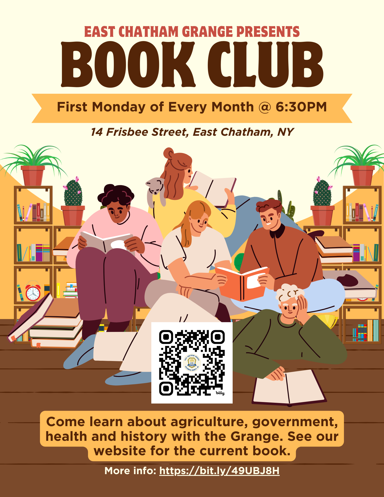 The East Chatham Grange will be hosting a FREE book club on the first Monday of every month at 6:30pm. The goal is to learn about government, education, health and agriculture together as a community. Everyone is welcome! We will read a different book each month or two. You should read the book prior to coming to book club.