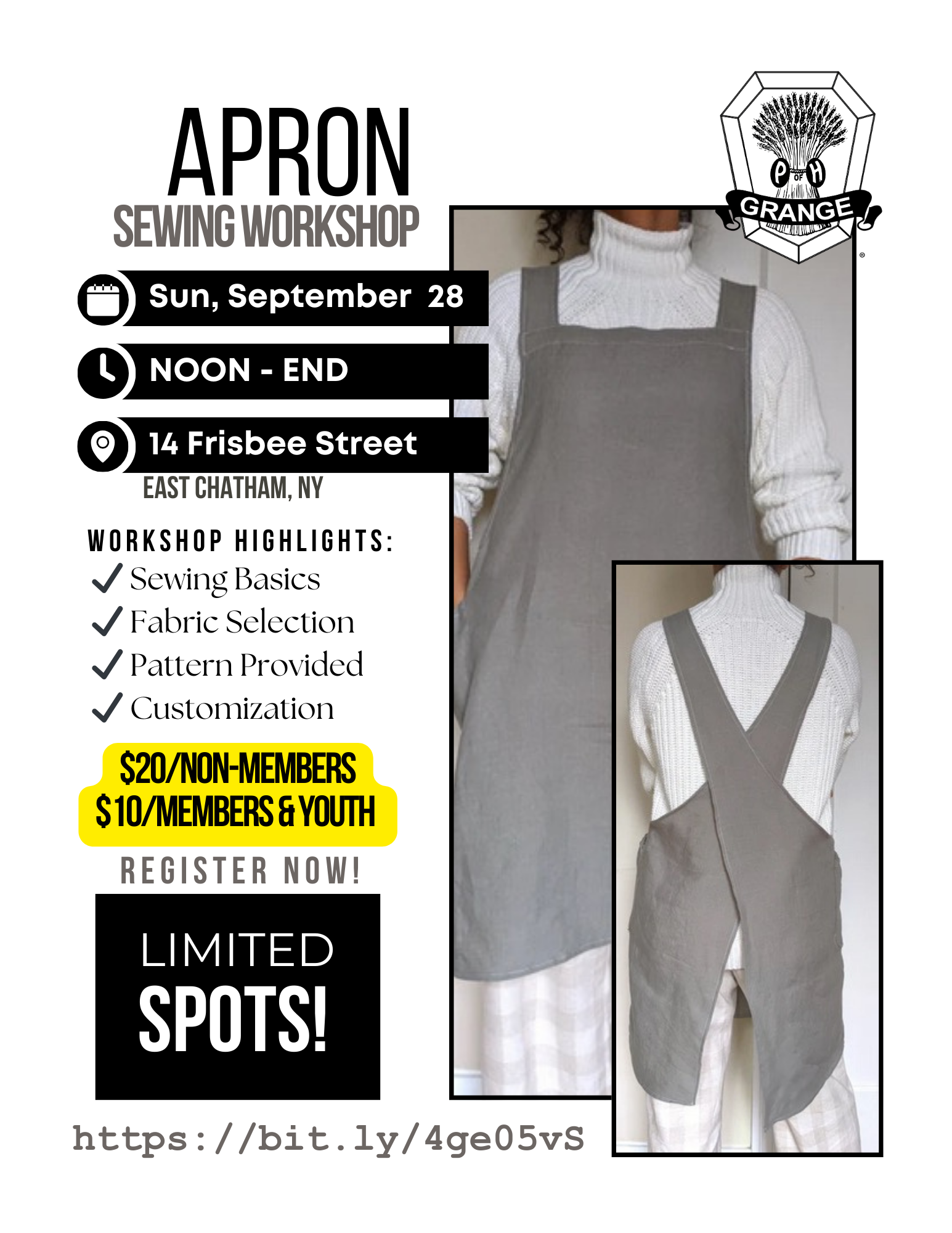 A pinafore apron is unique in that you don't have to tie anything! This simple garment can be sewn in a few hours and customized to fit any body. Workshop begins promptly at NOON. Please come a little early to allow time for setup.